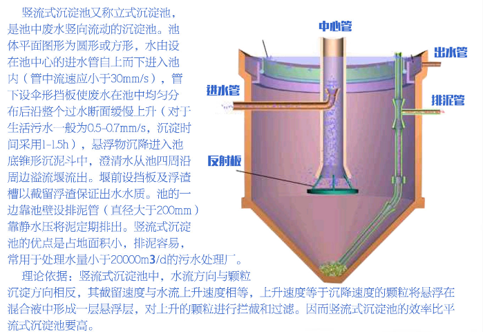 流式沉淀池是一種常用的沉淀池類型,其特點(diǎn)是水流方向與沉淀方向一致,從而提高了沉淀效果。豎流式沉淀池通常由池體、進(jìn)水管、出水管、排泥管等部分組成。