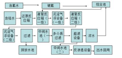 采用物理化學方法對電鍍廢水中的重金屬進行分離處理,通過兩次調(diào)節(jié)廢 水的 pH 值,使廢水中堿性重金屬離子和中性重金屬離子分別在其最佳的沉淀 環(huán)境內(nèi)進行沉淀分離, 達到去除重金屬的目的,使廢水達到《電鍍污染物排放 標準》(GB21900-2008)中的標準,再對達標的廢水進行雙膜法(超濾膜+反 滲透膜)分離,進一步去除水中的各類金屬離子,反滲透膜清水側(cè)出水達到電 鍍清洗工藝用水水質(zhì)標準,回用于電鍍生產(chǎn)線,反滲透濃水側(cè)出水再經(jīng)過一次 物化沉淀,最終使?jié)馑_標排放。