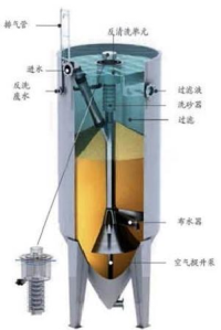 工作原理:活性砂過濾器基于逆流原理,待處理的原水通過進水管進入過濾器內部,經底部布水器均勻分配后向上逆流通過濾床,過濾后的濾液在過濾器頂部匯集后溢流排出過濾器系統。在空壓機的作用下,空氣提升泵將過濾器底層被污染的臟砂提升至過濾器頂部的洗砂器中,通過水流的紊流作用將砂表面的污染物分離出。清洗后的凈砂利用自重返回到砂床中,而清洗砂所產生的污水從過濾器的排污口排出。